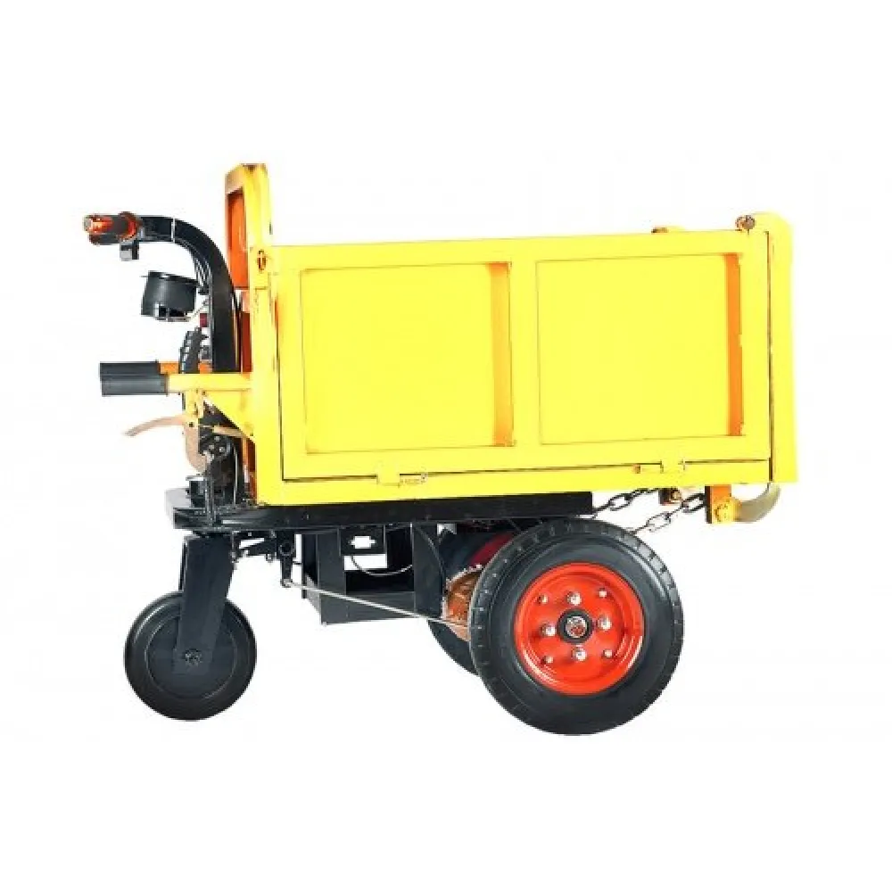 По принципу действия техника напоминает тачку и выполняет его функции. При этом управление намного проще и функциональнее. При мощности двигателя 900 Вт и емком АКБ тс способно развивать скорость до 8 км/час и преодолевать достаточное для полноценного рабочего дня расстояние.